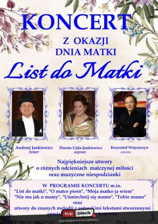 Wzruszający koncert zatytułowany "List do matki" zawiera najbardziej znane utwory o matczynej miłości i o znaczeniu Matek w naszym życiu. W znakomitym wykonaniu uznanych i utytułowanych artystów usłyszą Państwo m.in.: